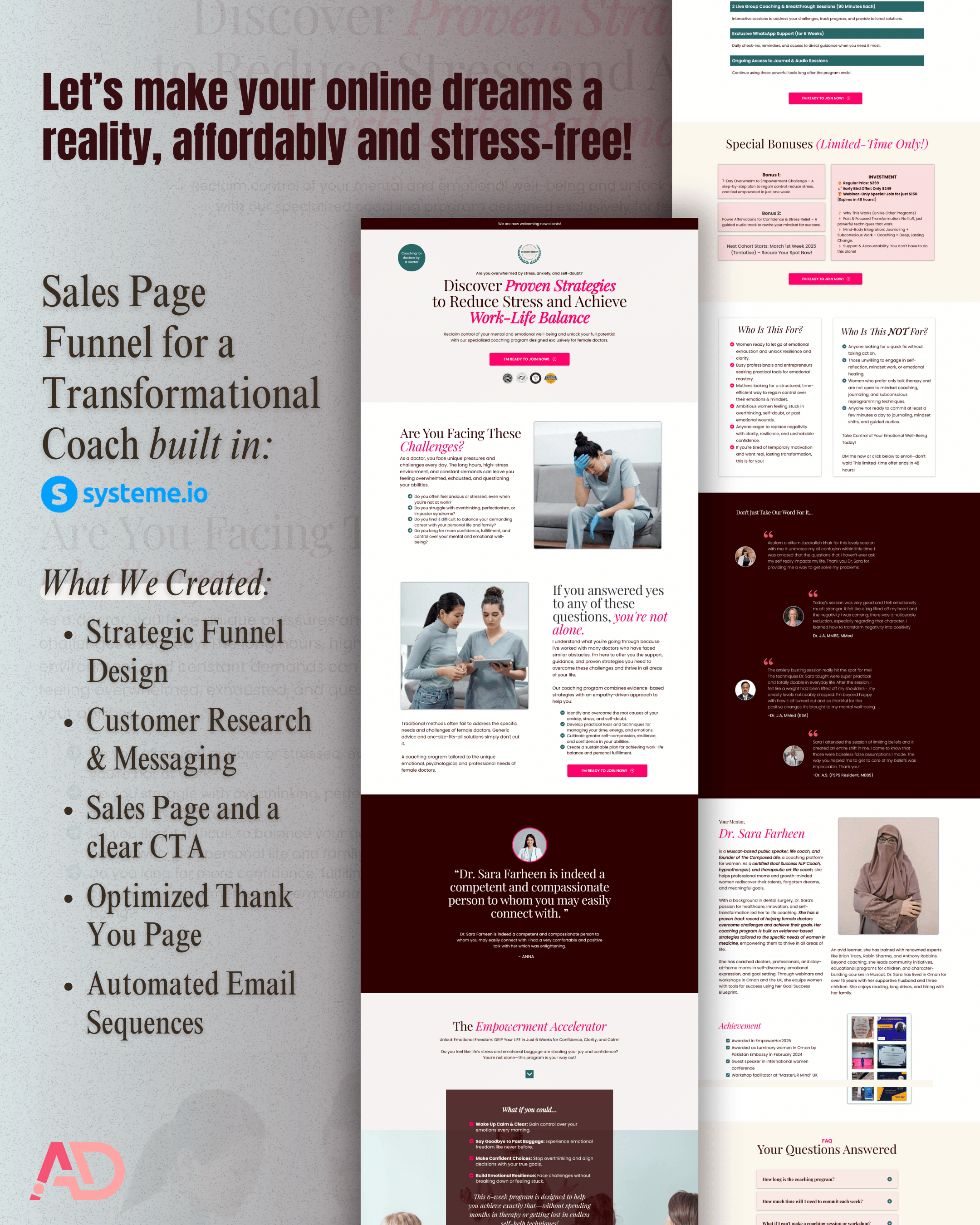 I am Dr Sara Farheen, Master NLP coach and hypnotherapist. I help Female professionals, and doctors overcome anxiety and self-doubt using my unique EmpoweredMedPro method I took Anna's services for creating my landing page, I found her so organized and on time, her work was well researched, I like the copy she made, and gave the landing page a beautiful design.